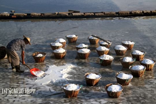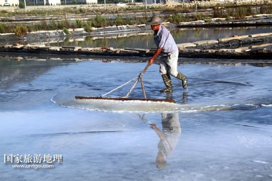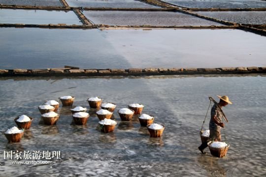 國家旅游地理 浙江臺州8月10日訊 8月10日,在浙江溫嶺市石塘鎮(zhèn)蒼岙鹽場,一名鹽工頂著太陽在鹽田里把曬好的鹽收集起來挑到鹽堆去。連日來,浙江省溫嶺市石塘鎮(zhèn)蒼岙鹽場的鹽工利用晴熱天氣忙著曬鹽。對于浙江的曬鹽人來說,夏季陽光最猛烈的7月、8月、9月這三個(gè)月是他們勞作的黃金季節(jié)。天氣越炎熱,光照越猛烈,曬鹽效果就越好。炎熱的夏天艷陽高照,而曬鹽人卻要頂著高溫出門勞作。 /新華社發(fā)(梁敏慧 攝)