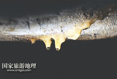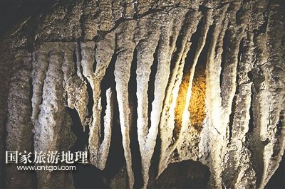 離開前洞,順路蜿蜒3公里至后洞,洞口依舊狹小,僅能1人由吊繩垂入約2米著地,斜向下行約5米,石鐘乳洞豁然開朗,約500米見方,地面較為平坦,前壁有一紅色“龍形”圖案,頭頂石壁還有一匐匍向前的倒掛石龜,其旁掛著一串“葡萄”狀鐘乳石……