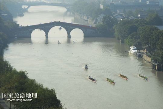 國家旅游地理 浙江杭州11月9日訊 11月9日,參加500米直道競速賽的龍舟隊從運河拱宸橋畔出發(fā)。當(dāng)日,2013年中國龍舟公開賽年度總決賽(杭州站)在京杭大運河杭州拱宸橋段舉行。 /新華社發(fā)(李忠 攝)