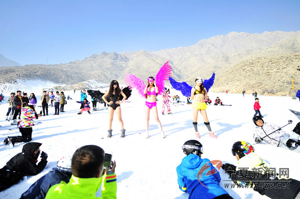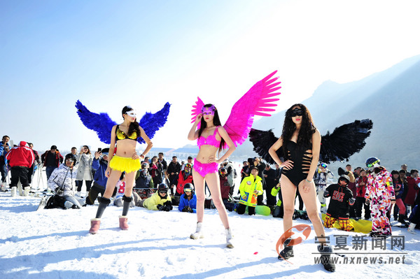 2016年1月1日,新年第一天,在銀川蘇峪口國家森林公園滑雪場,幾位身著色彩艷麗比基尼美女在雪中秀身材并展示瑜伽技巧,吸引了眾多滑雪愛好者的目光。當日,蘇峪口滑雪場前來滑雪的人達數(shù)千人。 寧夏新聞網(wǎng)記者 祁瀛濤 攝